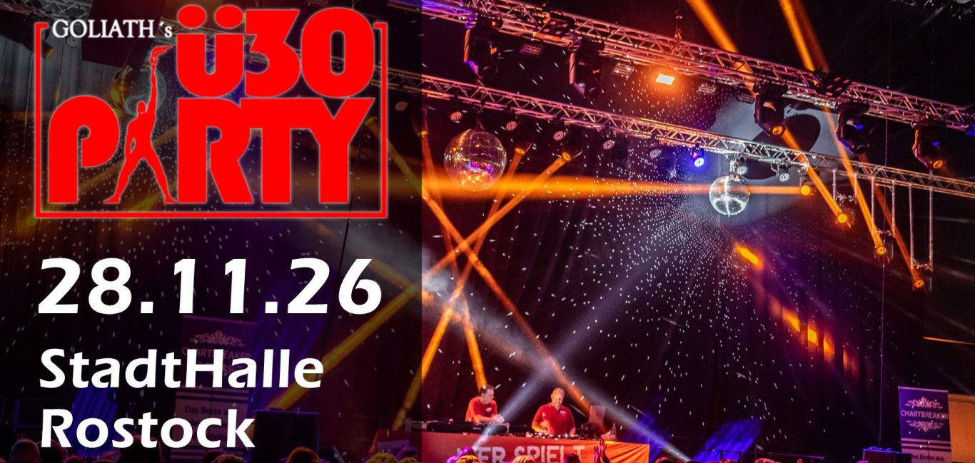 Goliath's legendäre Ü30 Party findet am 29.11.2025 wieder in der Rostocker StadtHalle statt. Freuen Sie sich auf sechs unterschiedliche Floors in einem breiten musikalischem Spektrum von 60er bis aktuelle Hits, Schlager, House, Black Music, und vielen mehr ist für Jeden was dabei!